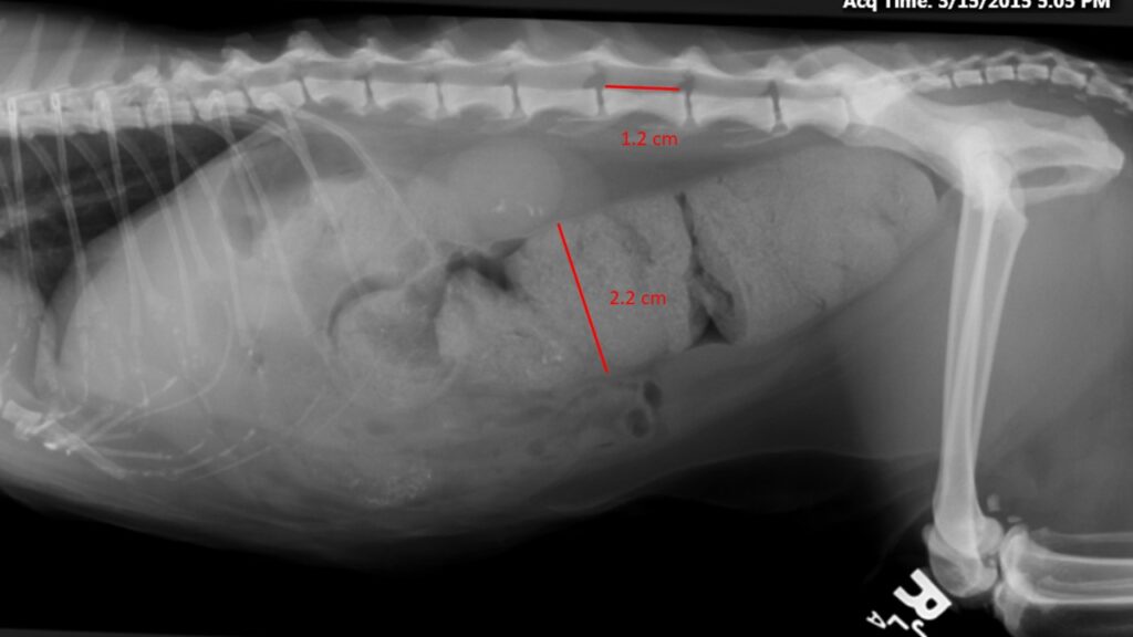 - Radiography abdomen + pelvis (at least a lateral and a ventrodorsal view): compare diameter of the colon with the length of L5. Old pelvic fracture? Masses or other abnormalities in abdomen? Foreign object in colon? Osteoarthritis?
